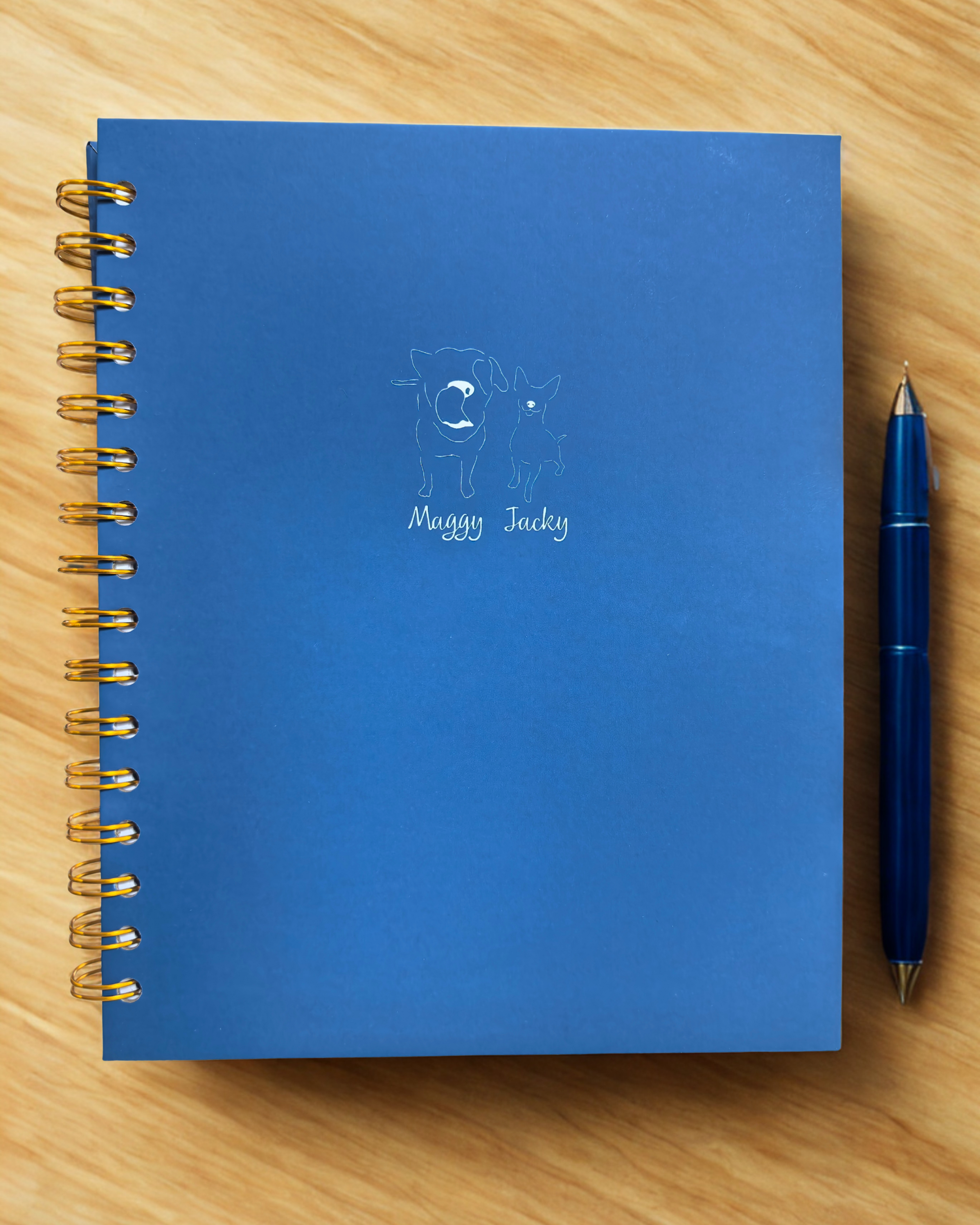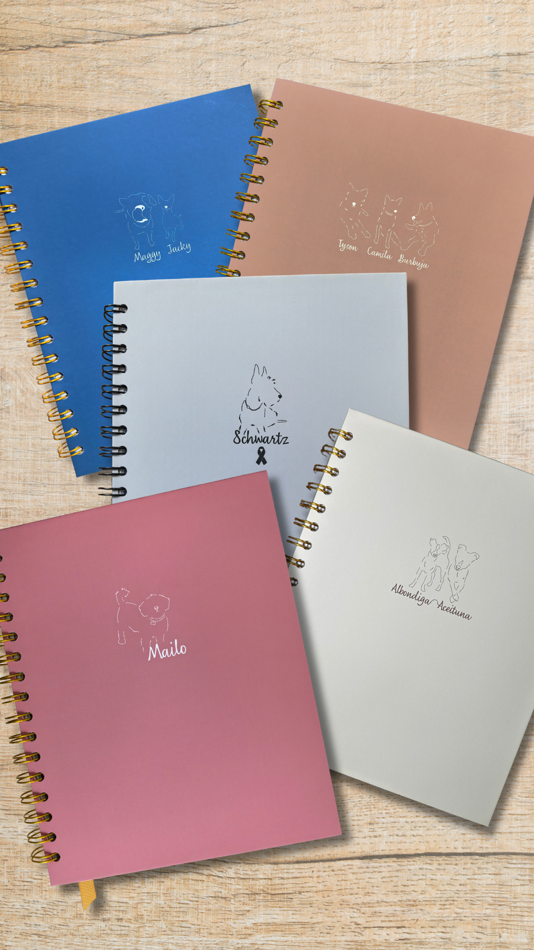 Agendas y libretas personalizadas con el dibujo y nombre de tu mascota en la portada. Con tu compra, donamos alimento a refugios y albergues de perritos y gatitos rescatados.