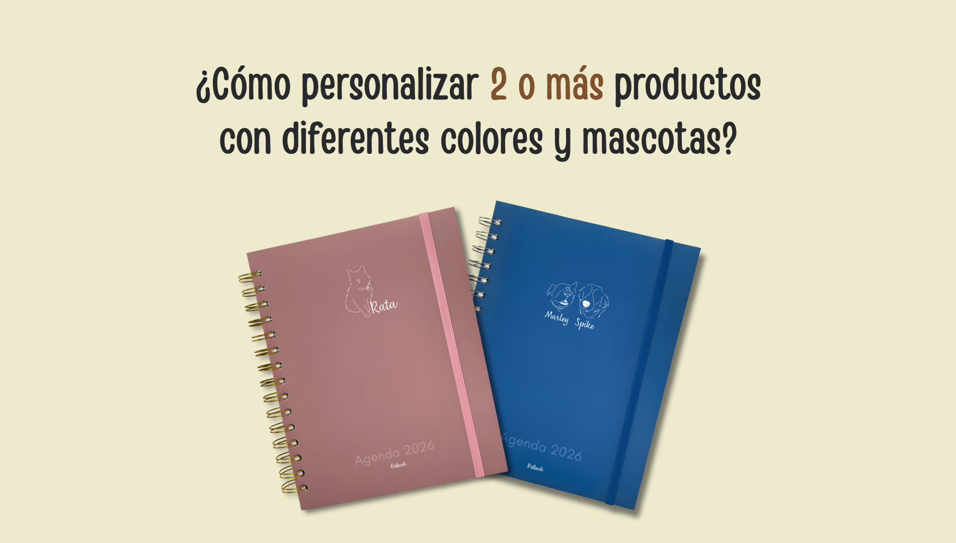 Agenda 2026 con portada personalizada con el dibujo y nombre de 3 mascotas.